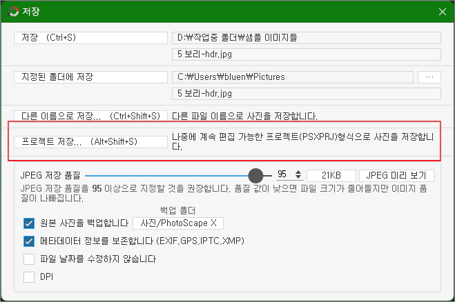 두 번째 이야기로 포토샵의 PSD와 유사한 기능을 하는 것이 프로젝트 저장입니다.