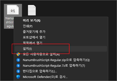 - NanumBrushScript-Regular.ttf라는 파일을 마우스 우클릭한 다음 설치를 클릭해 줍니다.