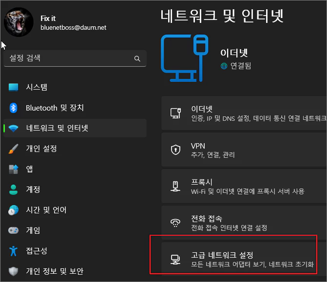 윈도우 설정 > 네트워크 및 인터넷 > 고급 네트워크 설정을 클릭합니다.