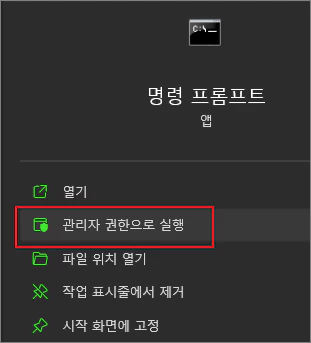 윈도우 작업표시줄의 검색 상자에 CMD라고 입력한 다음 관리자 권한으로 명령 프롬프트를 실행합니다.