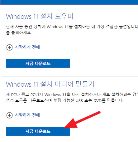 두 번째에 있는 윈도우 11 설치 미디어 만들기 항목의 지금 다운로드 버튼을 클릭해 다운로드를 시작합니다.