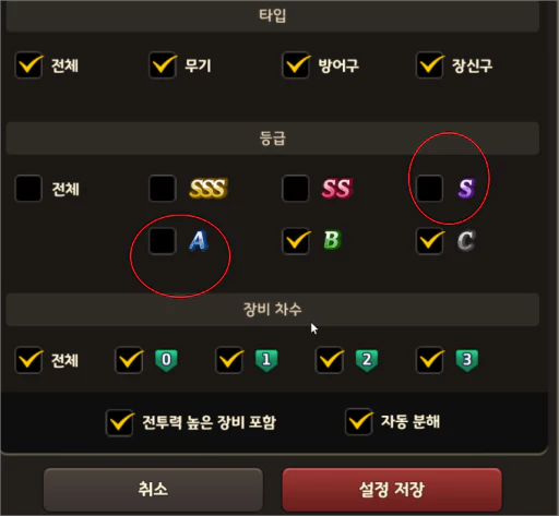 따라서 분해 설정에서 1회에 한해서 보라 템을 체크 해제하고 분해해보고, 그래도 안되면 파랑 템까지 체크 해제하고 분해를 시도해 봅니다. 이렇게 하면 모든 분해 오류가 해결됩니다.