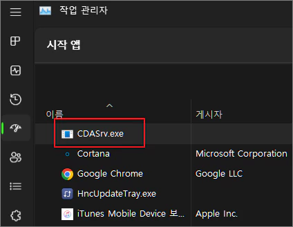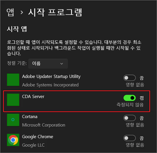 윈도우 설정의 앱 항목에서 시작 프로그램을 클릭해 보았는 데, 원래는 존재하지 않았던 CDA Server라는 항목이 윈도우 시작 시에 함께 시작되도록 등록되어 있었던 것입니다.