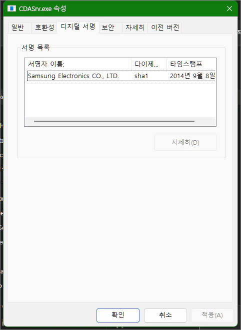 이 파일의 정체를 알아보기 위해 마우스 우클릭 후 속성의 디지털 서명 항목을 살펴보면 삼성전자 영문명인 Samsung Electronics라는 이름이 나옵니다.