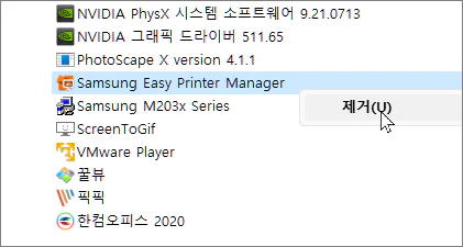 윈도우 시작 설정에서 사용 안함으로 꺼두기해도 되지만 아예 삭제를 원할 경우에는 제어판에서 Easy Printer Manager를 삭제하면 위의 CDA Server 항목도 함께 사라지게 됩니다.