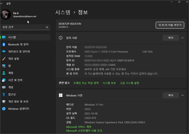 하지만 윈도우 업데이트 이후 현재는 윈도우 11은 물론 윈도우 10 역시 모두 바탕화면의 내 PC 우클릭 후 속성을 선택하면 윈도우 설정의 시스템 정보 부분이 열리게 됩니다. 이 부분은 정말 그냥 눈으로 정보만 보는 것으로 사용자 입장에서 뭔가를 설정하고 변경할 수 있는 옵션이 거의 없습니다. 이전의 시스템 속성 창과는 완전히 다른 창이라고 봐도 무방합니다.