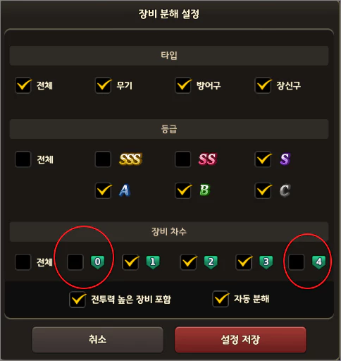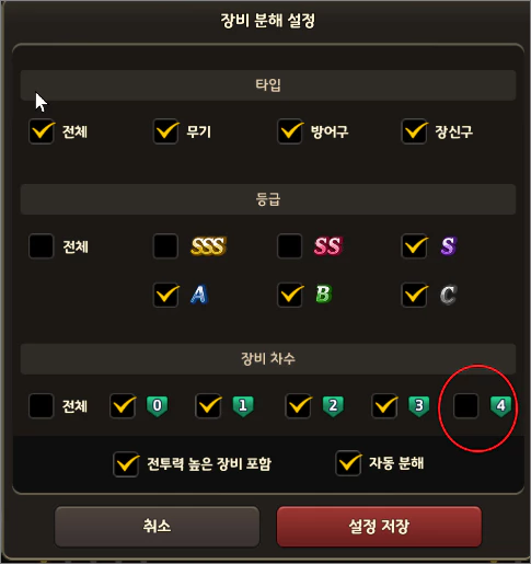 그러나 바로 다시 한번 분해 설정을 열어 보면 아래와 같이 다시 체크가 되어 있습니다. 이말은 4차 아이템도 모두 갈아 버린다는 말이 됩니다.