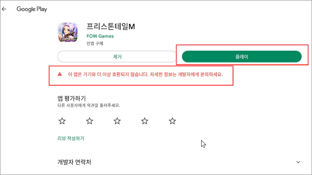 프리스톤테일m 매주 업데이트 시 원인은 모르겠지만 일정한 경우에 '이 앱은 기기와 더 이상 호환되지 않습니다. 자세한 정보는 개발자에게 문의하세요.' 메시지가 출력되면서 업데이트라고 표기되어 있어야 할 버튼이 플레이로만 표시되는 현상이 있습니다. 이 오류에 빠지면 검색해도 프리스톤테일m을 찾을 수 없으며 플레이 버튼만 무한 반복으로 업데이트를 진행할 수 없고 게임에 진입하는 불가능해집니다.