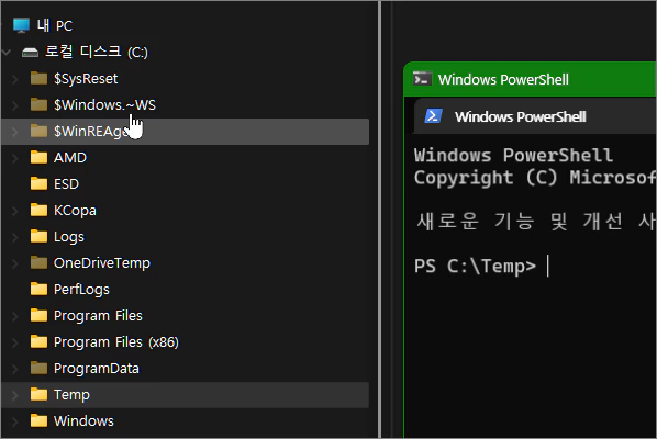 예를 들어 아래의 이미지에서 처럼 Temp 폴더에서 마우스 우클릭 후 '터미널에서 열기'를 클릭할 경우에 해당 경로의 Windows Powshell 창이 열리게 되어 있습니다.