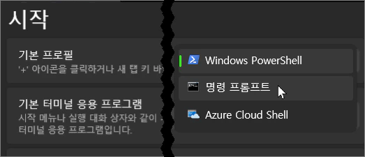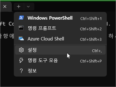 이 이미지에서 알 수 있는 것 처럼 마우스 우클릭 메뉴인 '터미널에서 열기'의 터미널이란 Windows PowerShell, 명령 프롬프트, Azure Cloud Shell의 3가지로 구성되어 있으며 그 순서는 사용자가 편의대로 선택할 수 있게 만들어 둔 것을 알 수 있습니다.