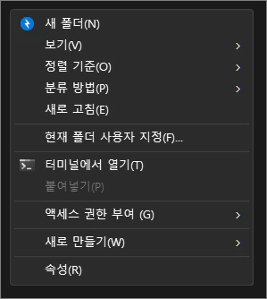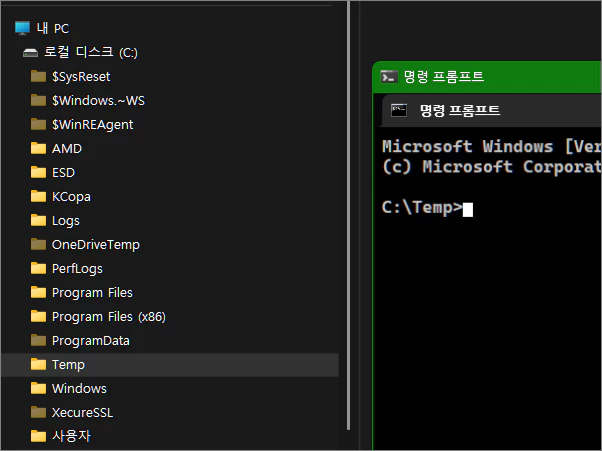 이제 마지막으로 확인을 위해 파일 탐색기의 Temp 폴더 위치에서 우클릭한 다음 '터미널에서 열기'를 클릭하면 명령 프롬프트(CMD) 창으로 해당 폴더의 경로가 열리는 것을 확인할 수 있습니다.