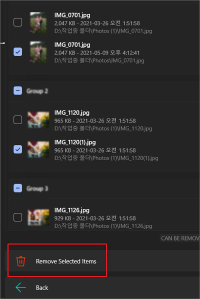 테스트를 위해 다운로드 폴더를 드래그하여 드롭시키고 Scan Duplicate Image Files를 클릭하면 다운로드 폴더 및 그 하위 폴더에서 중복되는 이미지 파일들만 찾아 줍니다. 미리보기로 중복된 파일들을 볼 수 있고 자동으로 하나의 파일에 체크되어 있습니다. 확인이 끝나면 밑에 있는 Remove Selected Items를 클릭해 삭제할 수 있습니다.