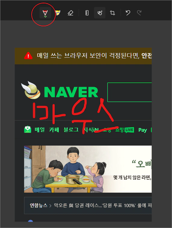 하지만, 애석하게도 윈도우 캡처 및 스케치는 요즘의 캡처 프로그램답지 못하게 추가 기능이 정말 형편없습니다. 기껏해야 마우스로 그림 그려 넣거나 형광펜 기능 또는 자르기 정도의 극히 기초적인 기능만 있습니다.