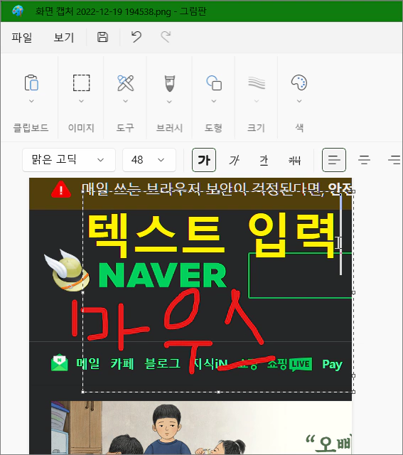 이제 캡처 이미지가 그림판에서 열리면 상단 메뉴 중 A라고 써진 텍스트 입력 버튼을 클릭해 원하는 텍스트 문구를 타이핑한 다음 크기나 색상, 폰트 등을 지정해 줍니다. 작업이 끝나면 파일 메뉴를 누르고 저장 또는 다른 이름으로 저장을 선택하면 작업이 끝납니다.
