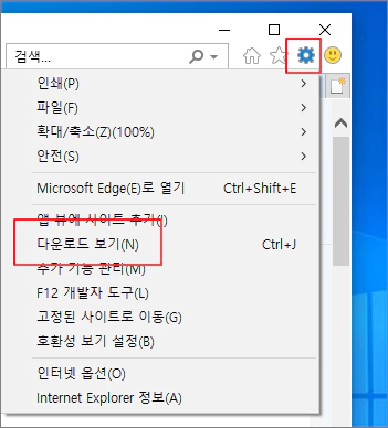 익스플로러 우측 상단의 톱니바퀴 아이콘을 누르고 '다운로드 보기(N)'를 클릭합니다.