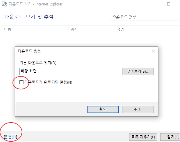 다운로드 보기 및 추적 옵션 창이 열리면 좌측 하단의 옵션을 클릭합니다.