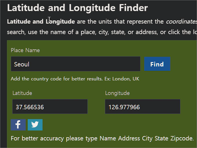 후자의 '사용자의 위치에 대한 지리 좌표'라는 링크를 클릭해 거주지 영문명을 입력하면 자동으로 위경도의 좌표가 나오게 됩니다. 이러한 위도 및 경도 기준의 지리 좌표를 사용하면 조금 더 섬세하게 일출 및 일몰 시간을 구성할 수 있습니다.