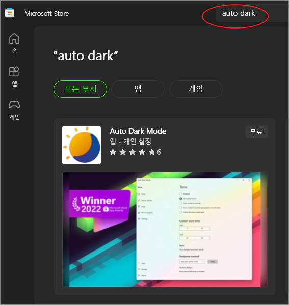 작업 표시줄의 흰색 가방 모양의 MS 스토어 아이콘을 클릭해 스토어로 이동한 다음 auto dark로 검색하고, Auto Dark Mode 앱을 설치합니다.