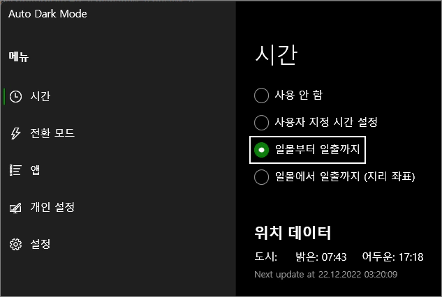 다크 모드와 라이트 모드 간에 일출 또는 일몰을 기준으로 자동으로 변환이 이루어지도록 설정하려면 시간 항목을 선택하고 '일몰에서 일출까지'를 선택하거나 '일몰에서 일출까지(지리 좌표)'를 선택해 주면 됩니다.