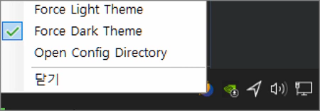 오토 다크 테마 앱을 설치한 후에는 윈도우 시작과 함께 작업 표시줄 우측의 시스템 트레이에 자동으로 들어가게 되므로 단축키 변경이 아닌 해당 앱 아이콘을 우클릭해 Force Lihgt Theme 또는 Force Dark Theme를 선택해 즉시 모드 변경을 시도할 수도 있습니다.