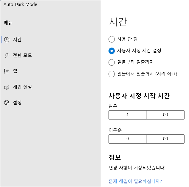두 모드 간의 전환을 일몰 또는 일출을 기준으로 자동으로 일어나게 설정할지, 또는 사용자가 지정한 시간에 자동 전환이 일어나게 만들지를 설정해 주어야 합니다.