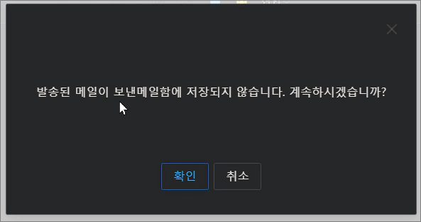 체크 표시를 클릭하면 발송된 메일이 보낸 메일함에 저장되지 않습니다. 계속하시겠습니까?라는 알림 팝업 창이 뜨게 됩니다. 확인을 눌러주고 작업을 계속합니다. 사실, 예약 메일함이 따로 있어서 보낸 메일함에 저장되지 않더라도 예약 메일은 예약 메일함에 저장되므로 팝업의 내용은 신경 쓰지 않으셔도 됩니다.