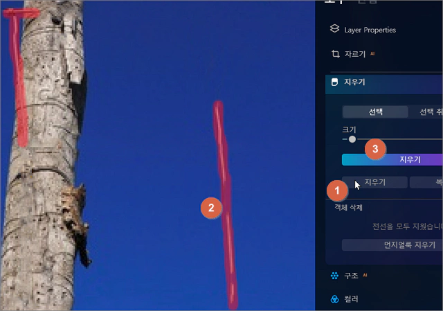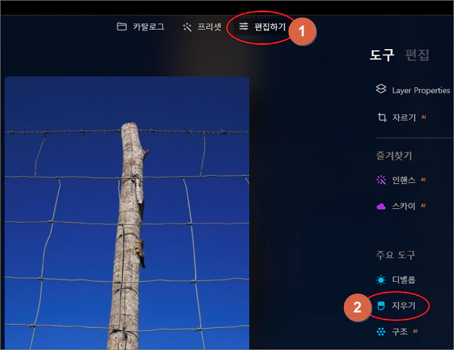 철조망 샘플 이미지를 선택한 다음 상단 메뉴에서 편집하기를 선택하고, 우측 메뉴에서 주요 도구 항목에 있는 지우기를 클릭합니다.