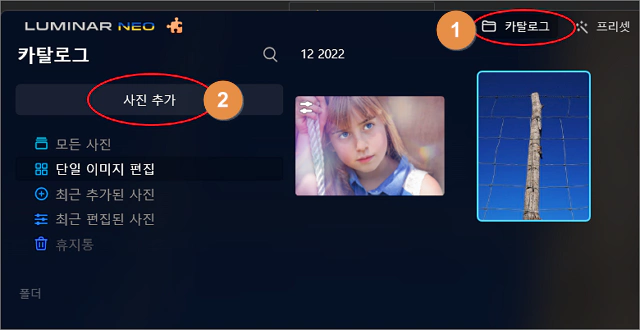 루미나 네오를 열고 상단 메뉴의 카탈로그를 선택한 다음 사진 추가를 클릭해 샘플 이미지를 불러 옵니다.