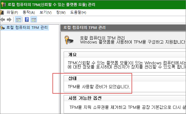 - TPM이 지원된다면 다음과 같이 표시됩니다.