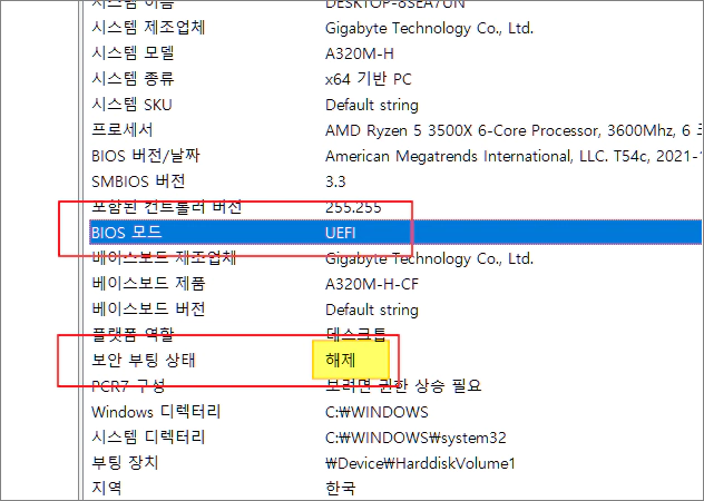 - 이 값이 해제라면 보안 부팅이 꺼져 있다는 의미이며, 원하는 경우 다시 활성화하실 수 있습니다.