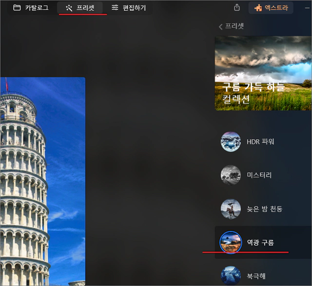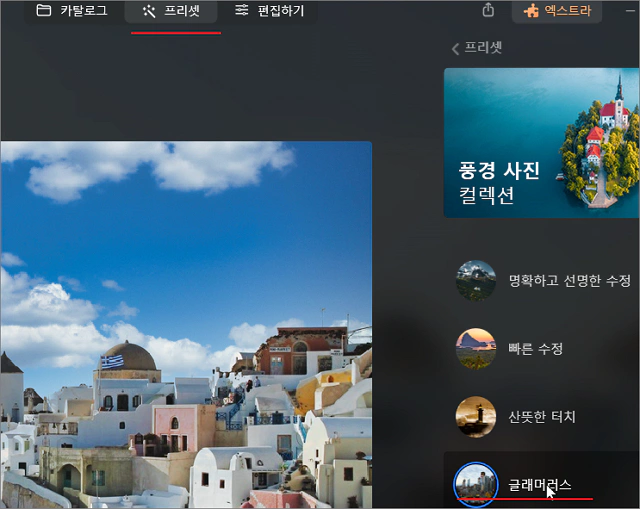 사진이 너무 흰색 계열이어서 간단히 프리셋 메뉴를 눌러 풍경 사진 컬렉션의 글래머러스 효과를 주고 편집하기로 넘어갔습니다.