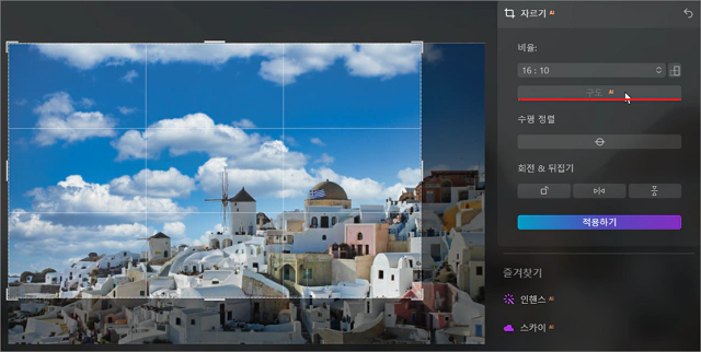 수평 정렬 버튼을 눌러 수평을 자동으로 맞춰준 다음 적용하기 버튼을 눌러 주면 최적의 구도와 수평으로 화면이 잘라내 집니다. 비율 항목 옆의 테트리스 아이콘처럼 생긴 것이 수평 정렬 또는 수직 정렬 전환 버튼입니다.