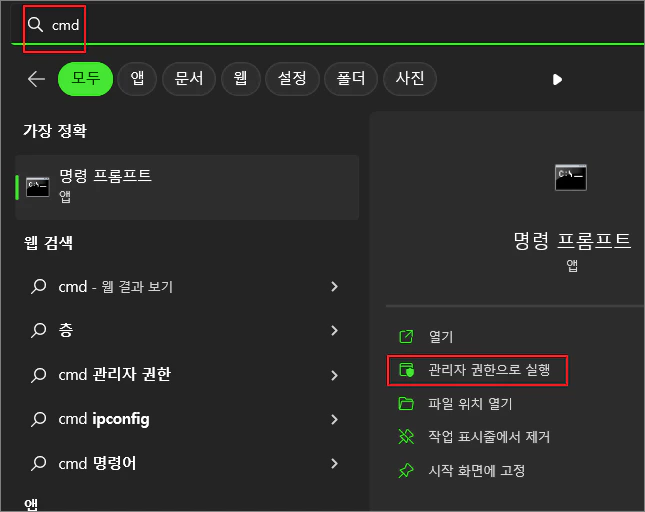 윈도우 작업 표시줄의 검색 아이콘을 누르고 CMD라고 입력한 다음 검색된 명령 프롬프트를 관리자 권한으로 실행합니다.