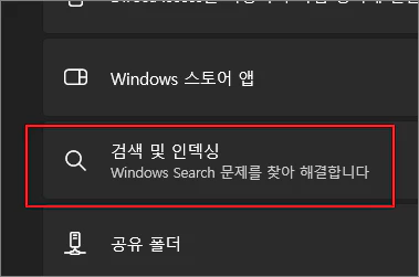만약 시스템에서 권장하는 문제 해결사가 없는 상태라면, 기타 문제 해결사로 진입한 다음 검색 및 인덱싱 문제 해결사를 실행합니다.