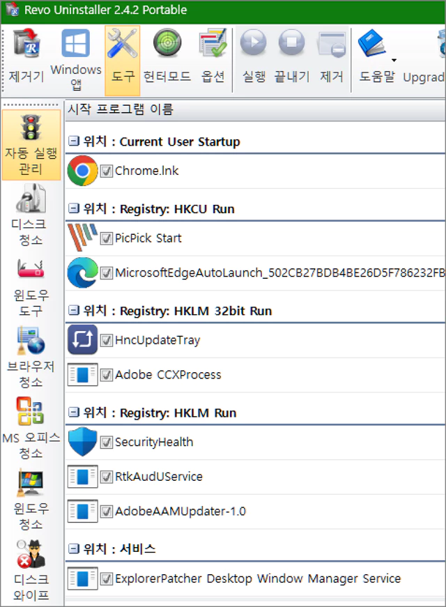 윈도우 시작 프로그램에 등록된 프로그램들은 물론 어떻게 시작되는지 잘 알 수 없는 레지스트리를 통해 시작하는 앱이나 프로세스들도 그 경로를 추적하여 알려주고 제거할 수 있도록 도와줍니다.