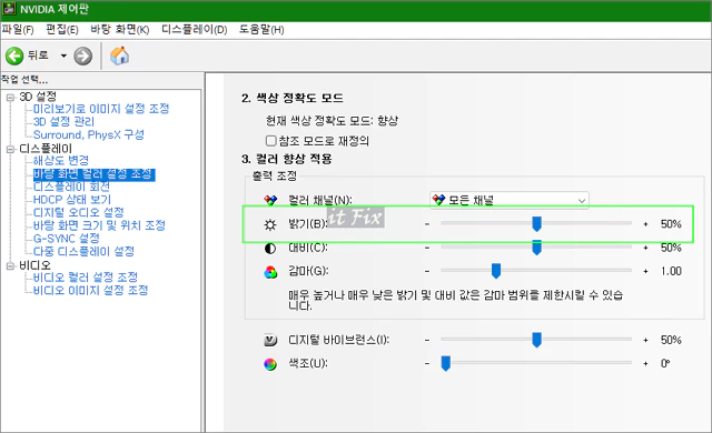 아래의 이미지는 엔비디아 그래픽 카드를 사용할 경우의 엔비디아 제어판 프로그램에서 밝기를 조절하고 있는 이미지입니다.