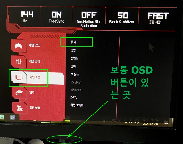 OSD(ON Screen Display)란 모니터 또는 TV에서 수동으로 화면 밝기 또는 대비등을 사용자가 조절할 수 있도록 내장된 프로그램을 말합니다. 이를 컨트롤하는 버튼은 보통 모니터의 베젤 하단이나 우측 옆면에 손가락을 밀어 넣어 더듬어 보면 돌출된 부분이 있으며 4방향으로 움직여 메뉴를 제어합니다.