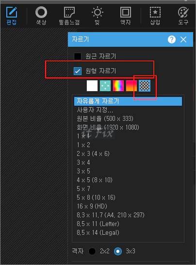자르기 메뉴가 열리면 원형 자르기에 체크해 주고, 바로 아래의 배경 지정은 가장 왼쪽의 투명 배경으로 지정해 줍니다.