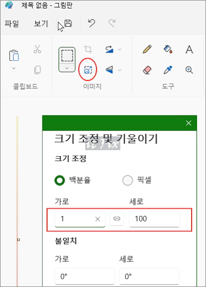 이제 상단의 크기 조정 메뉴 아이콘을 클릭해 백분율 1:100으로 작성해 줍니다. 이때, 1과 100 사이의 비율 유지 버튼은 꺼줘야 합니다.