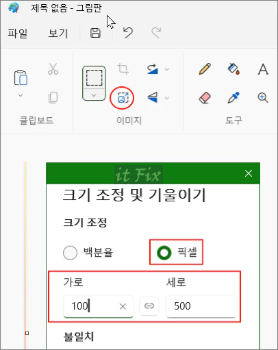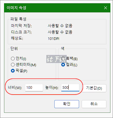 이번에는 백분율이 아닌 픽셀을 선택해 줍니다. 그런 다음 가로 세로 크기를 100:500으로 지정해 줍니다. 이번에도 동일하게 비율 유지 버튼은 꺼주도록 합니다.
