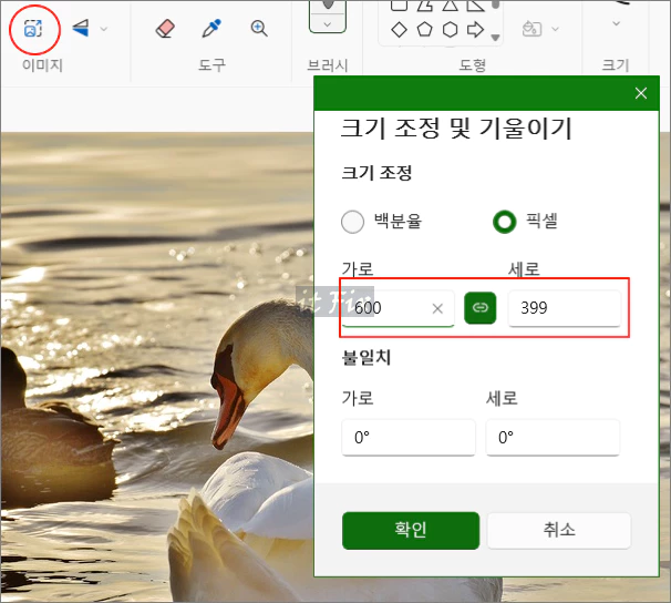 상단 메뉴의 크기조절 버튼을 클릭한 다음 크기 조정 및 기울이기 팝업 상자에서 픽셀을 선택한 다음 가로 크기를 600픽셀 정도로 맞춰 줍니다. 대략 600 픽셀 정도로 맞추어도 웹페이지에서는 크게 차이가 없습니다. 가로와 세로 사이에 있는 연겨 결 고리 모양의 비율 유지가 활성화된 상태에서는 가로 픽셀 값만 입력하면 세로 크기는 자동으로 맞춰집니다.