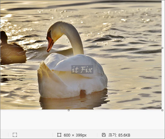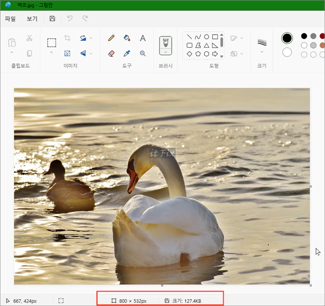 그림판에서 백조 이미지를 불러 오면 아래쪽으로 해당 이미지의 가로 세로 크기와 용량을 보여줍니다.
