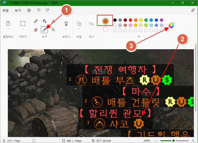 그림판에서 색상 코드를 알아내고자 하는 이미지를 불러 온 다음의 순서는 아래와 같습니다.