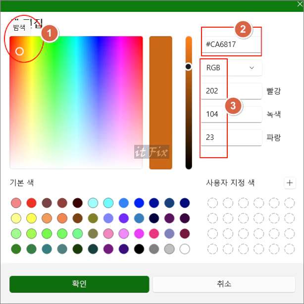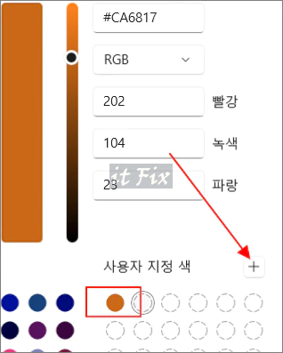 ③ 색상 코드 값 아래로는 RGB 값 202, 104, 23을 보여 주고 있습니다.