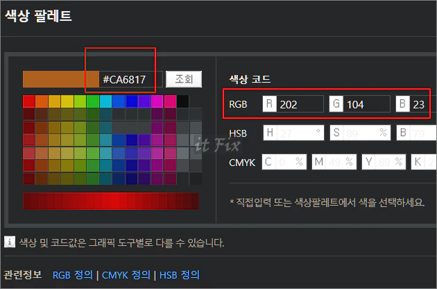 위에서 추출한 색상 코드 값이 정확한지 검증해 보기 위해 네이버 색상 편집표 페이지로 이동한 다음 왼쪽의 색상 코드 값입력칸에 #CA6817을 입력한 다음 조회 버튼을 누르면 우측으로 202, 104, 23이라는 RGB 값이 자동 생성됩니다.