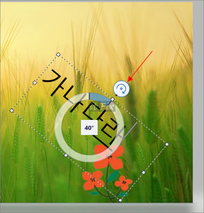 회전하는 방법은 텍스트 입력후 선택 툴을 이용해 텍스트 입력 부분을 선택해 준 다음 상단의 회전 버튼을 누르는 것으로 매우 간단합니다.