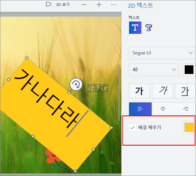 - 텍스트의 배경도 회전시키고자 한다면 우측의 옵션 창에서 배경 채우기에 체크 표시해 준 다음 회전하면 됩니다. 배경 채우기를 하게 되면 아래의 이미지에서 처럼 마치 2D 그림판에서 회전시키는 경우와 동일한 상태가 됩니다.