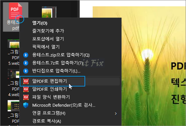 물론, 좀 더 쉬운 방법으로 무료 프로그램인 알 PDF가 설치되어 있을 경우 윈도우 파일 탐색기에서 해당 PDF 파일을 마우스 우클릭 후 알 PDF로 편집하기를 클릭하면 알 PDF에서 바로 해당 문서를 불러올 수 있습니다.