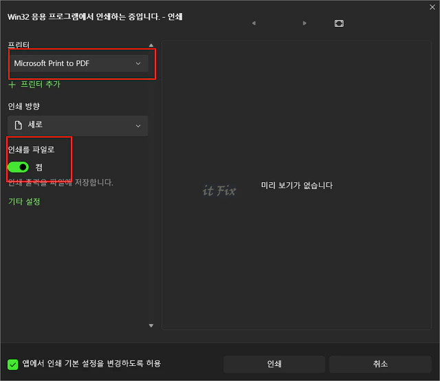 인쇄 메뉴에서 프린터를 실제 프린터가 아닌 Microsoft Print to PDF를 선택하고 그 아래쪽에서 인쇄를 파일로 라는 옵션을 켜줍니다. 그다음 가로 또는 세로 등의 인쇄 방향을 정해주고 아래쪽의 인쇄 버튼을 눌러 줍니다.