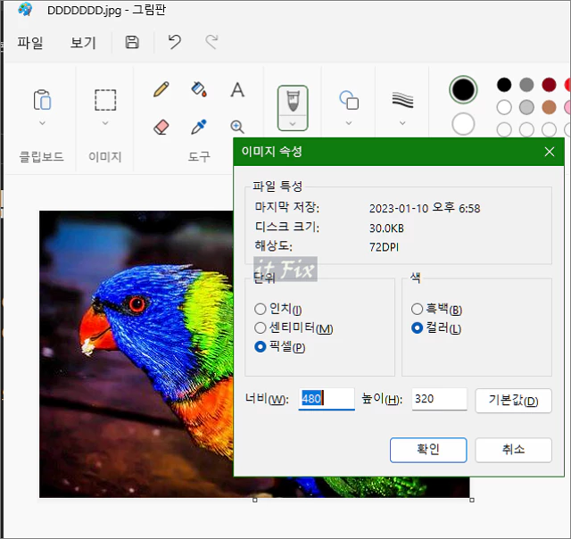 이미지 속성 창에서는 파일 크기, 해상도 DPI, 인치나 픽셀 등의 단위, 가로 및 세로 크기, 컬러 또는 흑백 등의 정보를 볼 수 있습니다.